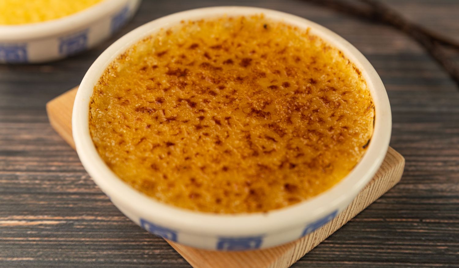 Vor dem Servieren ein wenig brauner Rohzucker/Zucker auf die Creme verteilen und mit einem Bunsenbrenner karamellisieren und sofort servieren.