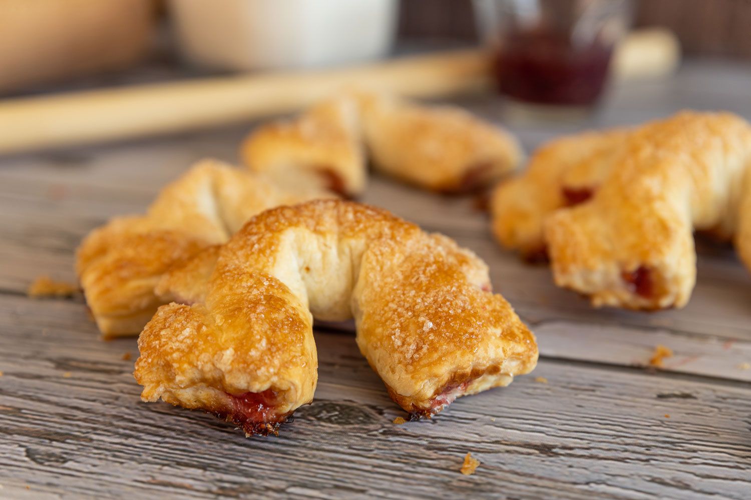 Auf jedes Teigstück nun ein wenig Marmelade, wie Z.Bsp. Himbeermarmelade geben. Nicht zu viel. Nur ein wenig