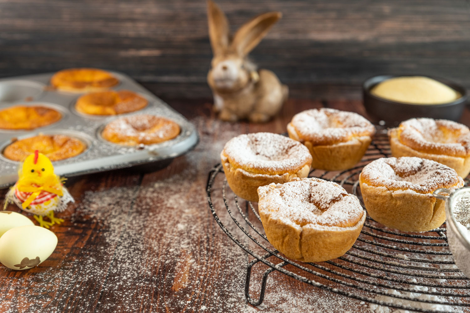 Abkühlen lassen, aus den Förmchen nehmen und mit Puderzucker besteuben.