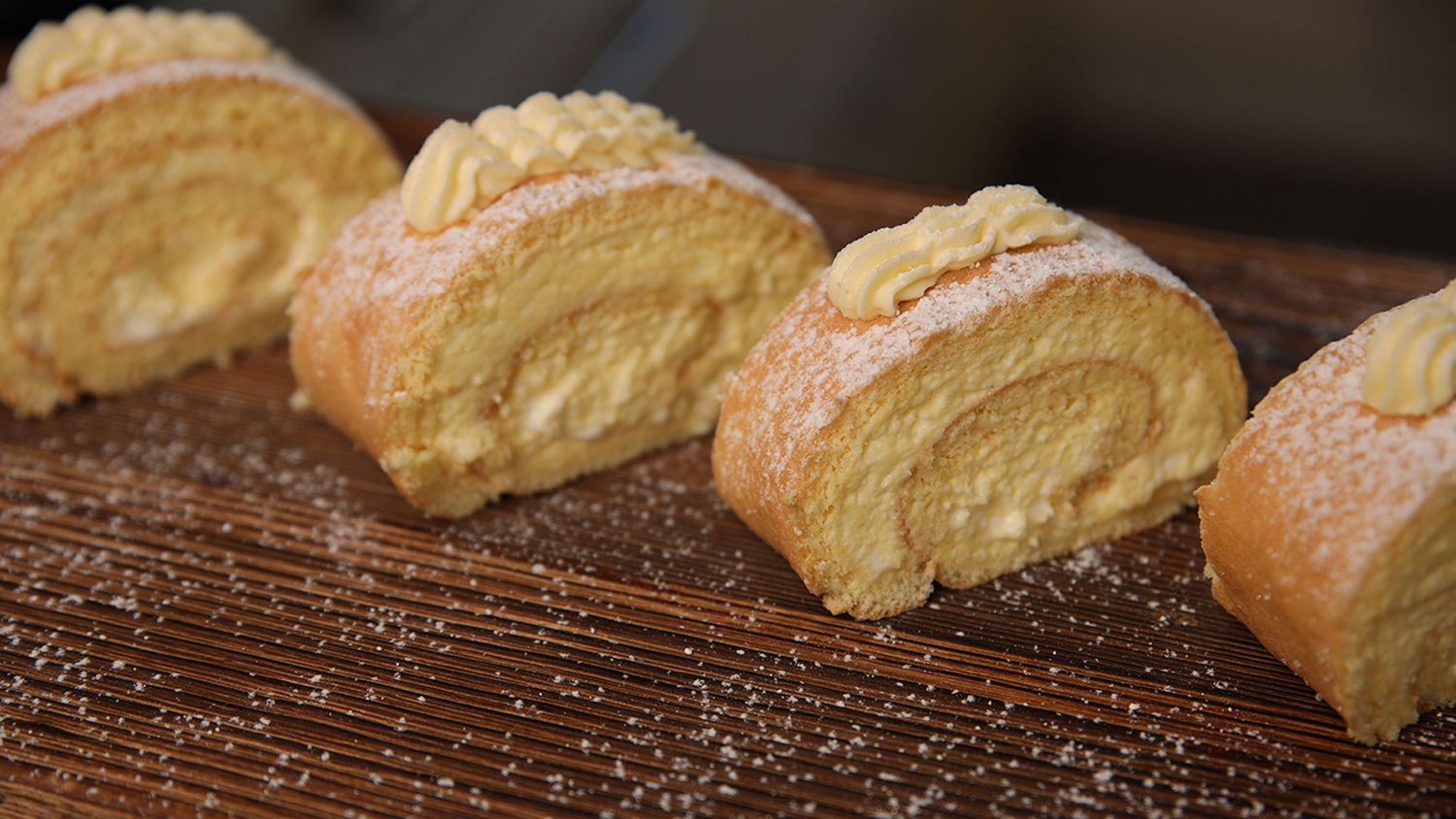 Nachdem das Rouladenbisquit abgekühlt ist, nimmst es drehst es um und legst es auf einen Tisch.